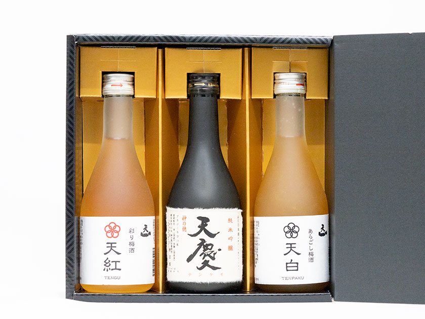 純米大吟醸酒で仕込んだ梅酒「天紅(tengu)」。吟醸酒ならではのすっきりとした香りと旨味、梅の酸味と甘みも感じられ紅色の綺麗な色味に仕上がっています。